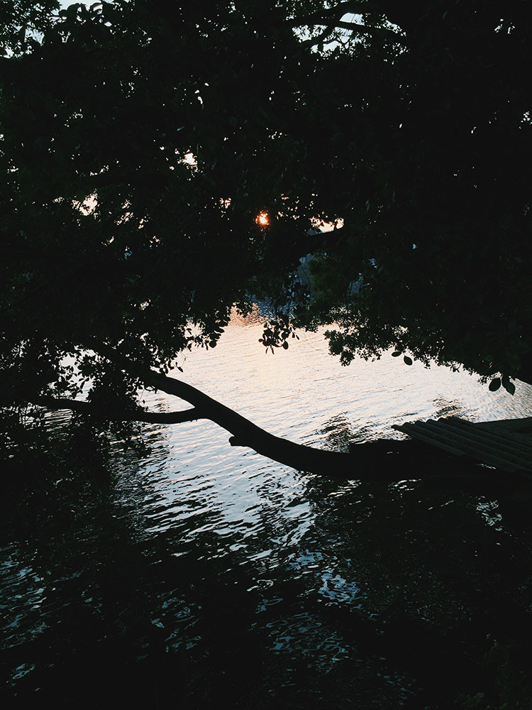 This was taken by the river in my hometown of Shantou, China. The sunset passed through the leaves and reflected on the river, like a painting.